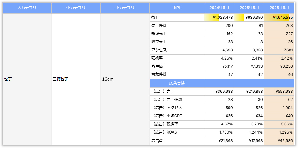 - カテゴリ・商品・広告単位で任意月のKPI比較ができ施策検証や次の戦略立案に活用可能。