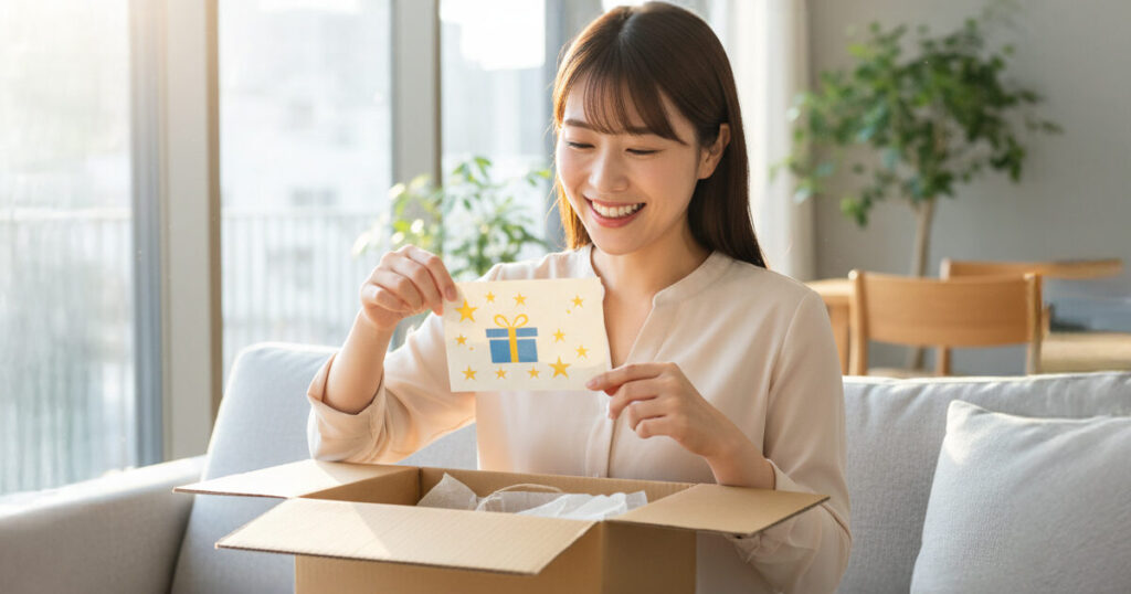 つまり、レビューを書いてもらうには、「思い出してもらう工夫」が必要なのです。そこで効果的なのが、商品到着時に「レビュー特典付きであること」を伝える同梱物の活用です。たとえば、「使い方ガイド」や「お礼メッセージ」に加え、「レビュー投稿でプレゼントをお届けします!」といった案内を同梱することで、ユーザーの記憶を呼び起こし、レビュー投稿のきっかけをつくることができます。