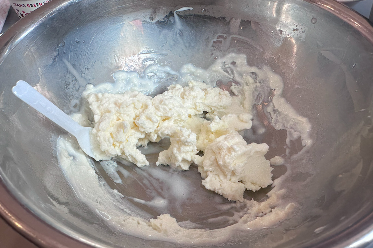 氷の上に置いた容器でミルクを根気よくかき混ぜれば、あっという間にアイスの完成!