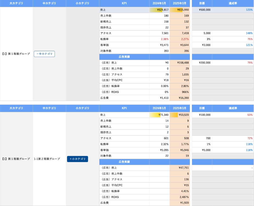 カテゴリ単位でのKPI目標設定と達成率の可視化