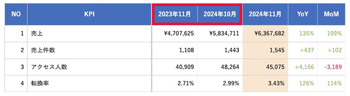 任意の月でKPIを比較できる機能