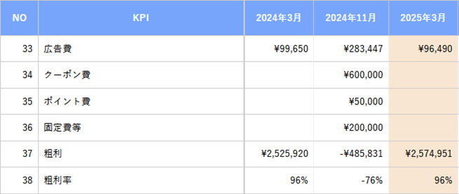 月額の固定費に加え、広告費・ポイント費・クーポン費などの経費を入力することで、粗利を自動で算出します。売上に対する利益がどの程度出ているかを、手間なく把握できるようになります。これにより、採算性の見直しや施策の費用対効果の検証がスムーズに行えます。