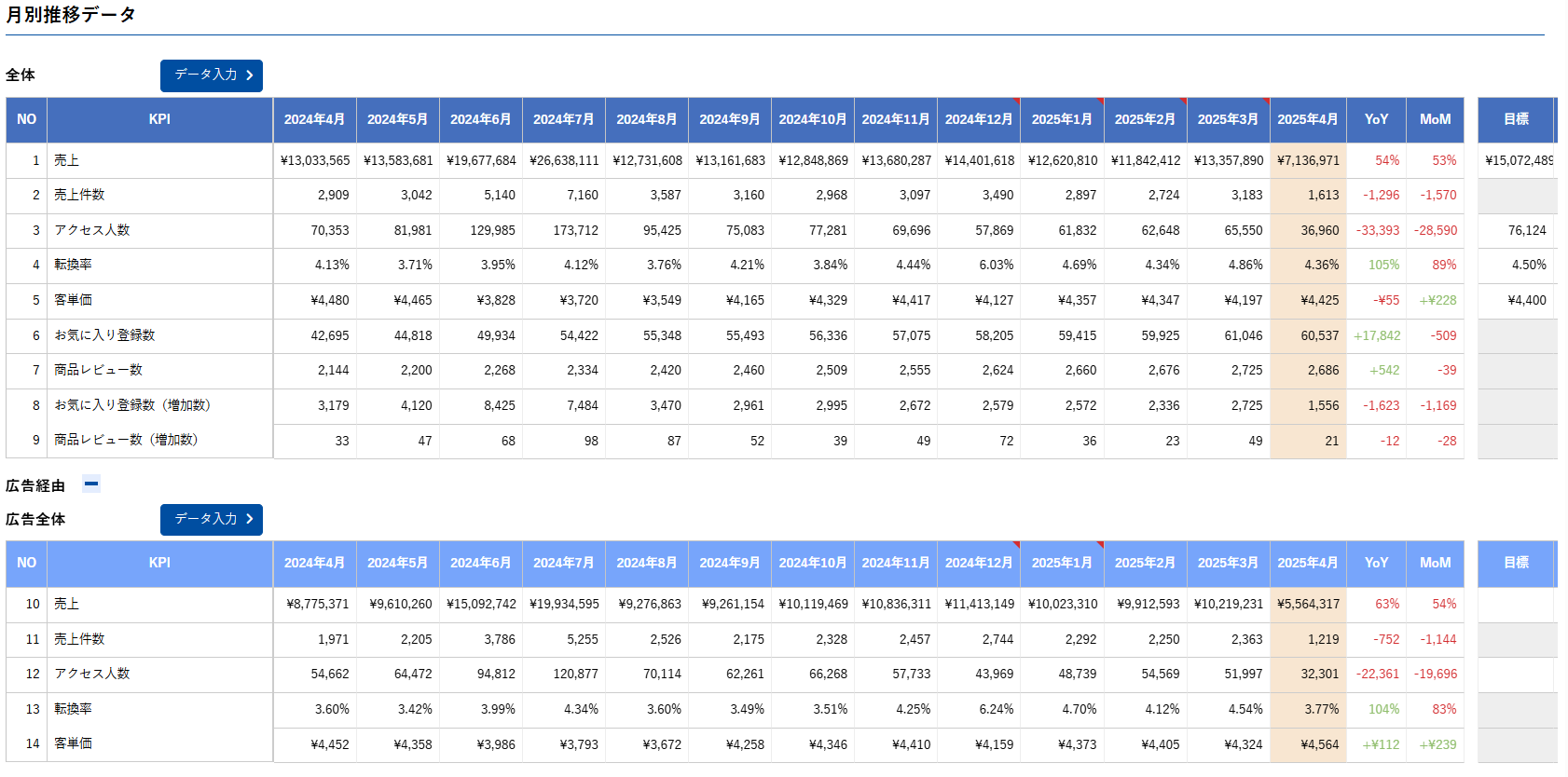 各月の数値に対して、自由にコメントを記録できます。施策の実施内容や外的要因を紐づけて残すことで、数値の変化をより深く振り返ることが可能になります。メモを残すことでチーム内での情報共有にも役立ちます。